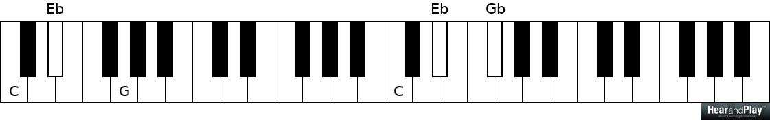 The diminished fifth interval can be formed when we make the perfect fifth, which is the interval between the first and fifth degree of the minor or major scale, smaller by lowering it a semitone (half step). Using the C minor scale:
